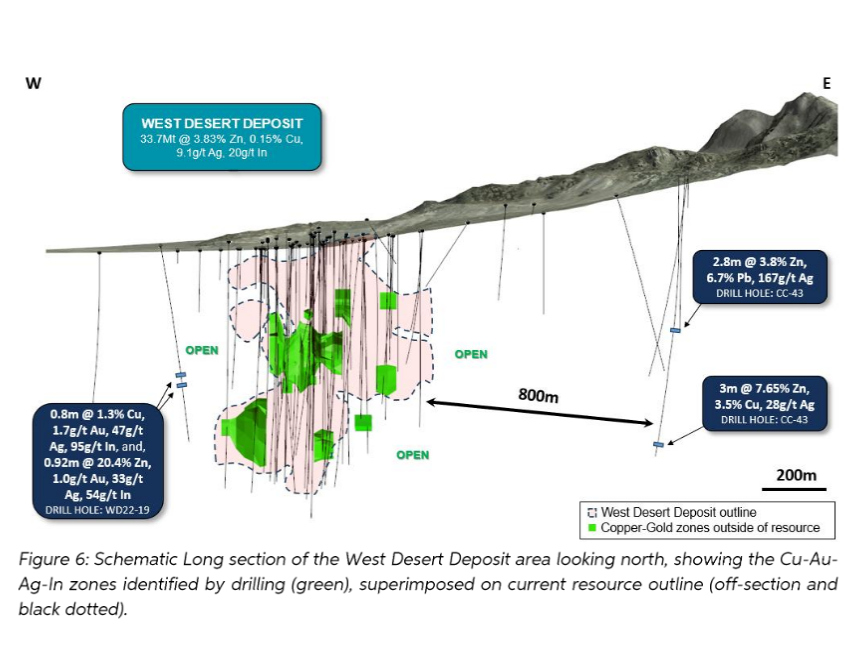 • 2.3% Cu, 5.0g/t Au, 43.1g/t Ag, 106g/t In from 588.4m to