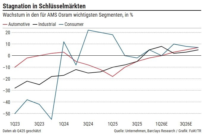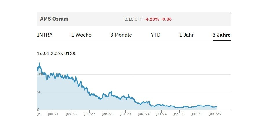 "«Übergangsjahr»: AMS-Osram-Aktionäre kennen diese euphemistische Umschreibung für eine Phase, in der weniger das operative Geschäft als vielmehr die nächste Transformationsrunde zählt. Seit Langem reiht sich eine Zäsur an die nächste: zunächst 2019 die Zustimmung der Osram-Aktionäre zur Übernahme durch AMS, dann ein Coronajahr, das den Zusammenschluss bremste. 2021 traf der Verlust wichtiger Apple-Aufträge den jungen Konzern. 2022 wurde offensichtlich, dass der Osram-Kauf des früheren Managements unter CEO Alexander Everke den finanziellen Spielraum überstrapazierte. 2023 bestimmten der Führungswechsel und eine Kapitalerhöhung die Agenda. 2024 sagte Apple überraschend ein Grossprojekt ab. Und 2025 zeigt sich, dass die Märkte von AMS Osram stagnieren (vgl. Grafik). Schon heute ist absehbar: Auch 2026 wird wieder mehr über Umbau und Bilanzfragen gesprochen werden als über das laufende Geschäft."