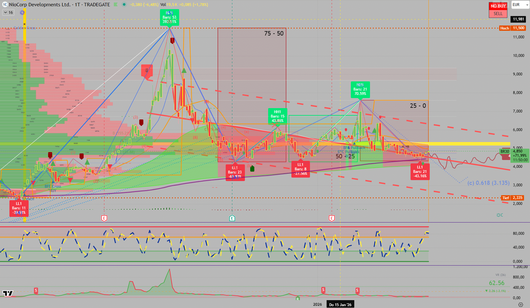 Kurzfristiger Trend (EUR): Seit dem Hochbereich um 11,50€ dominiert ein abwärtsgerichteter Verlauf mit Seitwärts-/Konsolidierungsphase im Bereich um 4,60–5,20€. Der aktuelle Kurs liegt um ca. 4,85€. Kurzfristig neutral bis leicht schwach, solange die Erholung nicht über die nächste Angebotszone kommt.