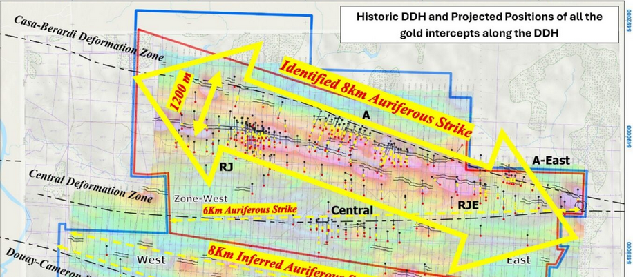 Zwei Bohrgeräte seien aktiv und würden systematisch die Zonen A und RJ entlang des 8-Kilometer-Korridors testen.