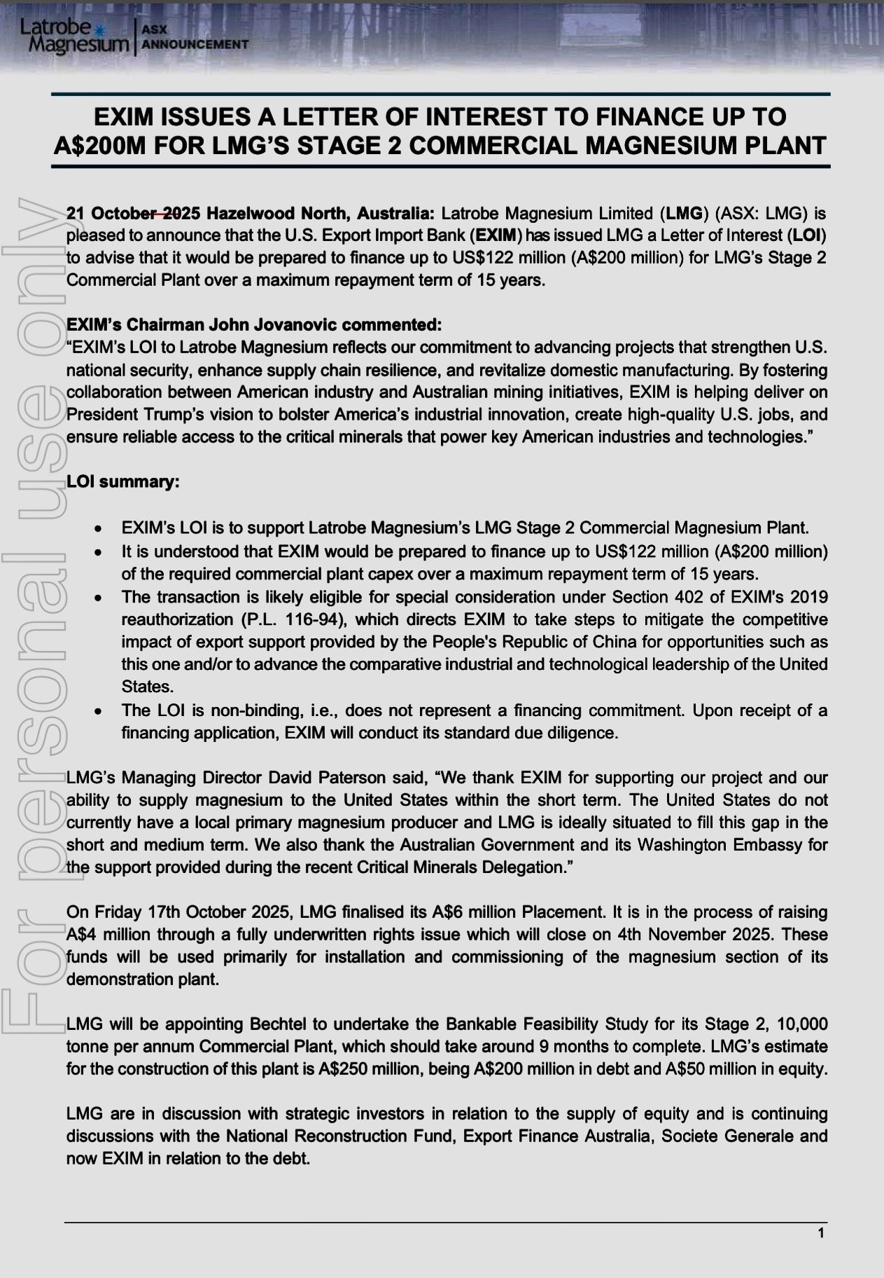 • EXIMs LOl dient der Unterstützung der kommerziellen Magnesiumfabrik LMG Stage 2 von Latrobe Magnesium.