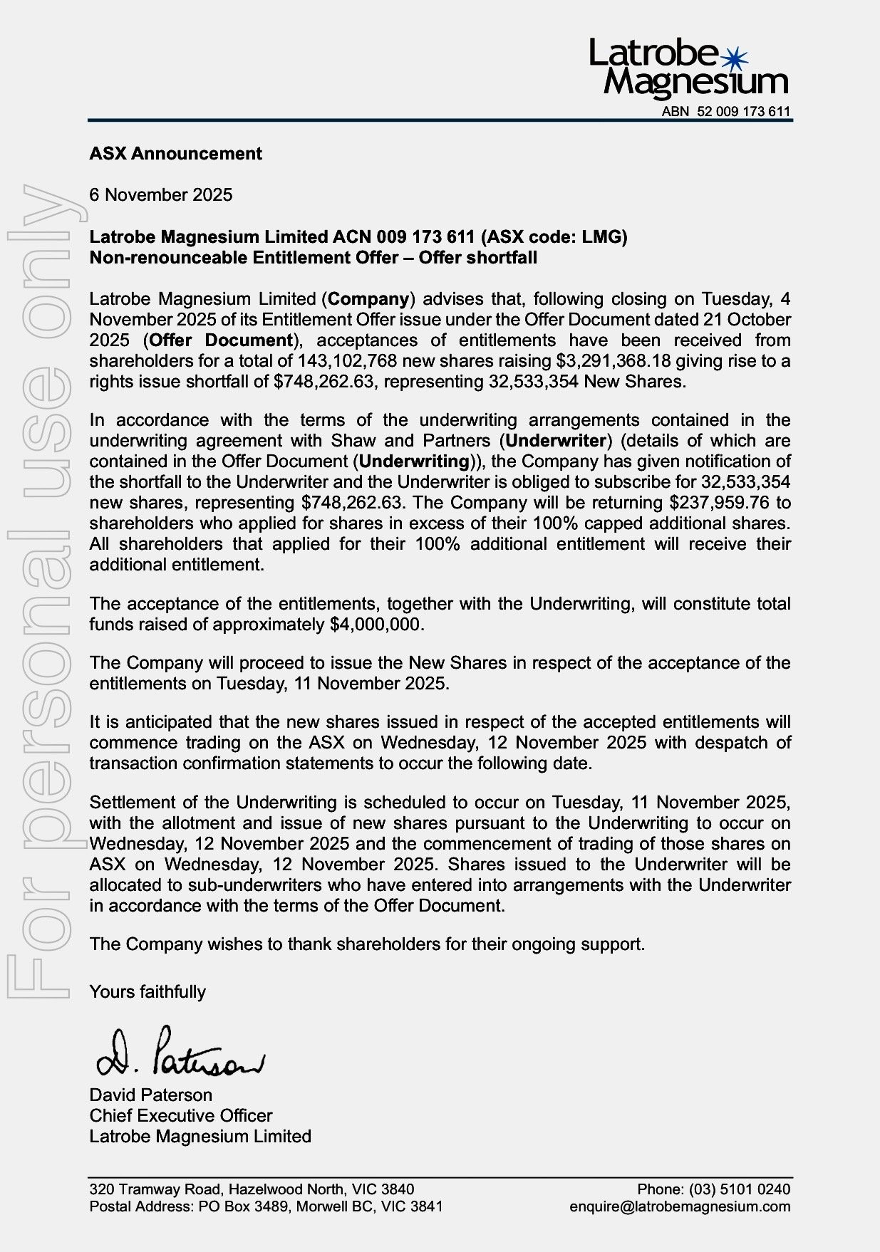 Latrobe Magnesium Limited (das Unternehmen) gibt bekannt, dass nach Abschluss seiner Bezugsrechtsemission gemäß dem Angebotsdokument vom 21. Oktober 2025 (Angebotsdokument) am Dienstag, dem 4. November 2025, Annahmen von Bezugsrechten von Aktionären für insgesamt 143.102.768 neue Aktien eingegangen sind, wodurch 3.291.368,18 AUD eingenommen wurden, was zu einem Bezugsrechtsdefizit von 748.262,63 AUD führt, was 32.533.354 neuen Aktien entspricht.