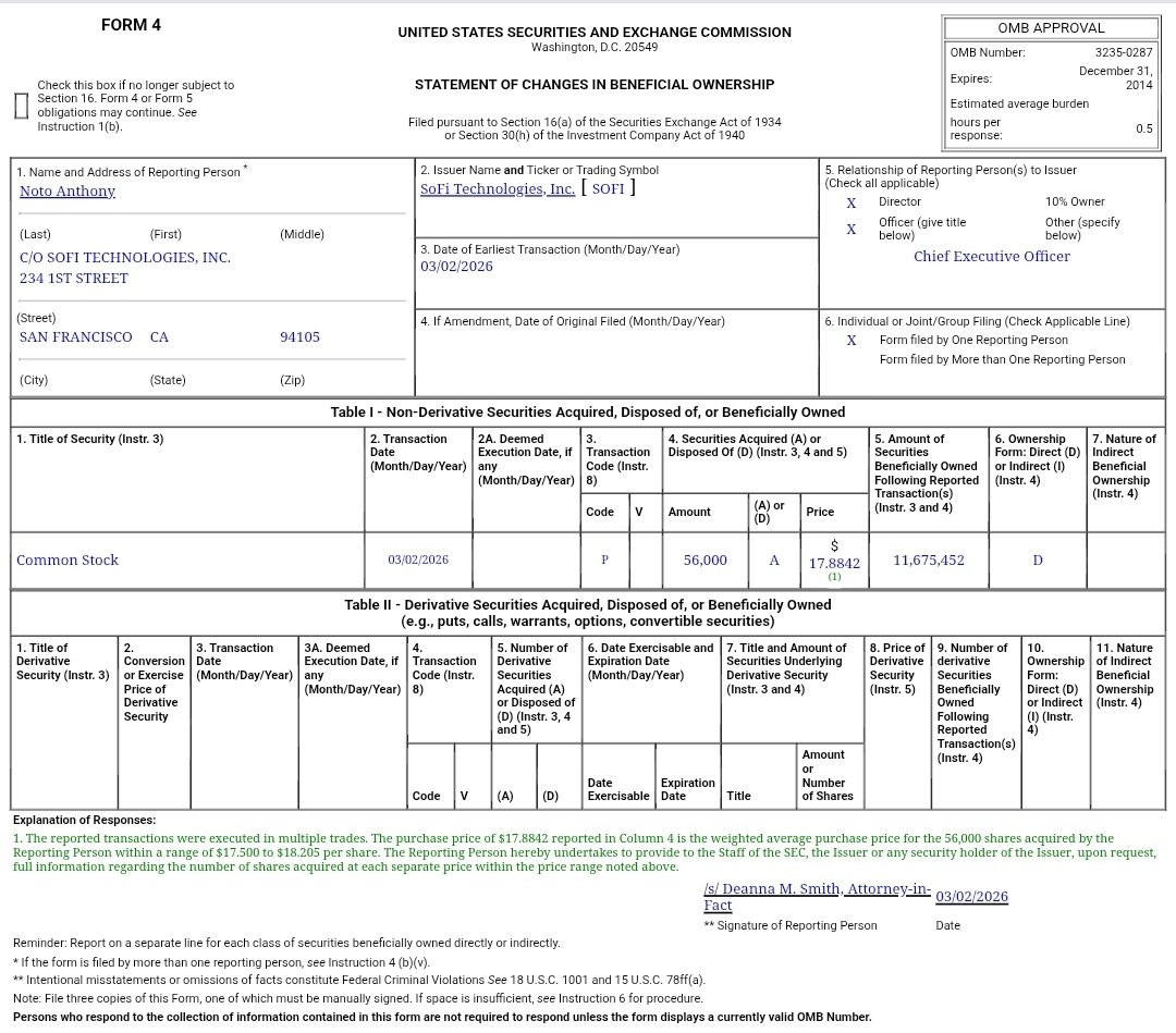 Das börsennotierte Unternehmen SoFi Technologies ist in USA gelistet. Das Unternehmen verfügt über eine Marktkapitalisierung von 19,63 Mrd.EUR und seine Geschäftsaktivitäten sind vorwiegend der Branche Finanzdienstleistungen zuzuordnen. Die Aktie verzeichnet eine Jahresperformance von -33,48 %. Die aktuelle Monatsperformance beträgt +4,73 %. Derzeit notiert die Aktie -45,85 % unter ihrem 52-Wochen Hoch und +104,15 % über ihrem 52-Wochen Tief. Der aktuelle SoFi Technologies Realtimekurs (12.03.26) liegt bei 17,720$. Damit ist die SoFi Technologies Aktie (A2QPMG) in 24 Stunden um -4,37 % gefallen. Auf 7 Tage gesehen hat sich der Kurs der SoFi Technologies Aktie (ISIN US83406F1021) um -5,14 % verändert. Der Verlust der SoFi Technologies Aktie auf 30 Tage, seit dem 11.02.2026, beträgt -13,90 %.Kursziel SoFi Technologies und Analysten Einschätzungen
