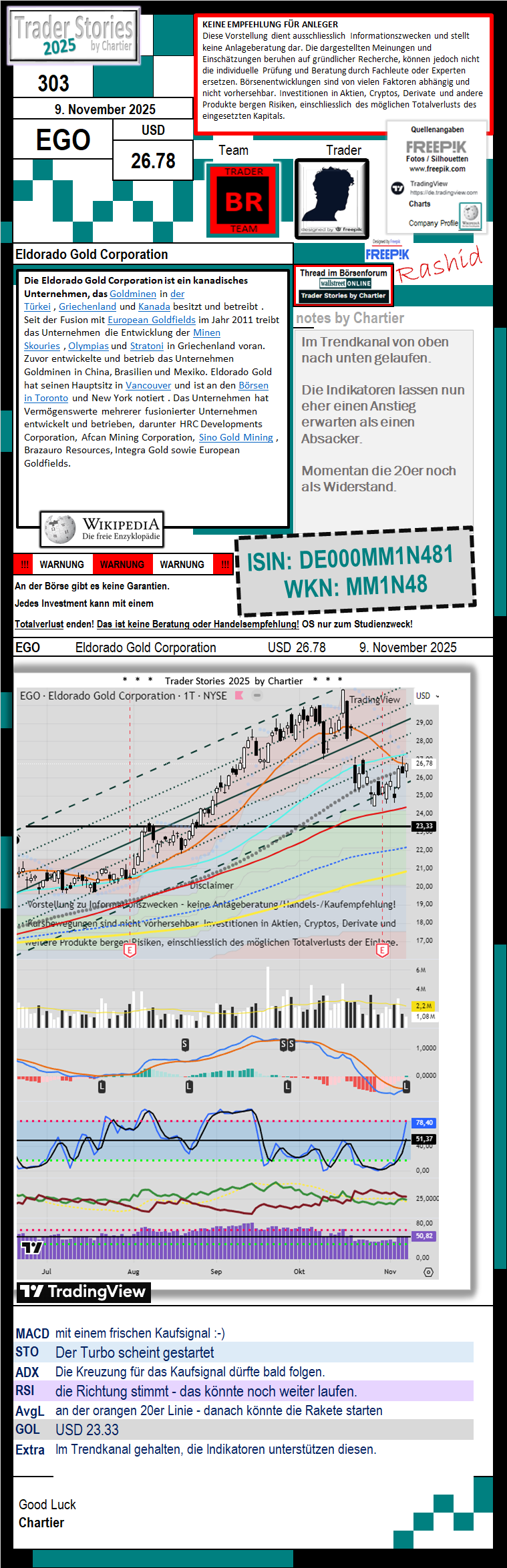 Zuversicht bei Eldorado: Margenstarke Geschäftsentwicklung (Anm. 45% Wachstum bei Goldproduktion bis 2027) in Kanada, Griechenland und Türkei, langlebige "umweltfreundliche" Gold-Kupfer-Mine Skouries nimmt 2025 Betrieb auf, Dividendenberücksichtigung ab 2026, Aktienrückkaufpogramm 2025, weitere Projektentwicklung Perama Hill in Griechenland in Genehmigungsphase, Exploration