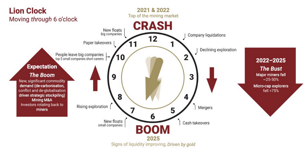 Hedley Widdup, CEO des ASX-Fonds „https://stockhead.com.au/company/lion-selection-group-lsx/”, hat den Beginn eines neuen Bergbaubooms ausgerufen und seine berühmte Bergbauuhr auf sechs Uhr gestellt. Er setzt auf Gold-Junior-Unternehmen, die zu Beginn des Zyklus die besten Renditen erzielen werden, da die Liquidität in großem Umfang auf den Markt zurückkehrt.