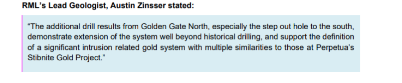 These are outstanding for intrusion-related systems. Many gold deposits are economic at ~0.5 g/t if near-surface and bulk mineable. RML’s results are:
