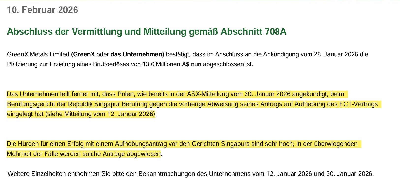 Das Unternehmen teilt weiterhin mit, dass, wie in der Mitteilung des Unternehmens an die ASX vom 30. Januar 2026 vorhergesagt, Polen nun beim Berufungsgericht der Republik Singapur Berufung gegen die vorherige Abweisung seines ECT-Antrags auf Aufhebung (Set-Aside-Motion) eingelegt hat (siehe Mitteilung vom 12. Januar 2026). Die Hürde, um in den Gerichten Singapurs auf einen Aufhebungsantrag Erfolg zu haben, ist sehr hoch, wobei die Gerichte in der überwiegenden Mehrheit der Fälle Aufhebungsanträge ablehnen. Bitte beachten Sie die Mitteilungen des Unternehmens vom 12. Januar 2026 und 30. Januar 2026 für weitere Details.