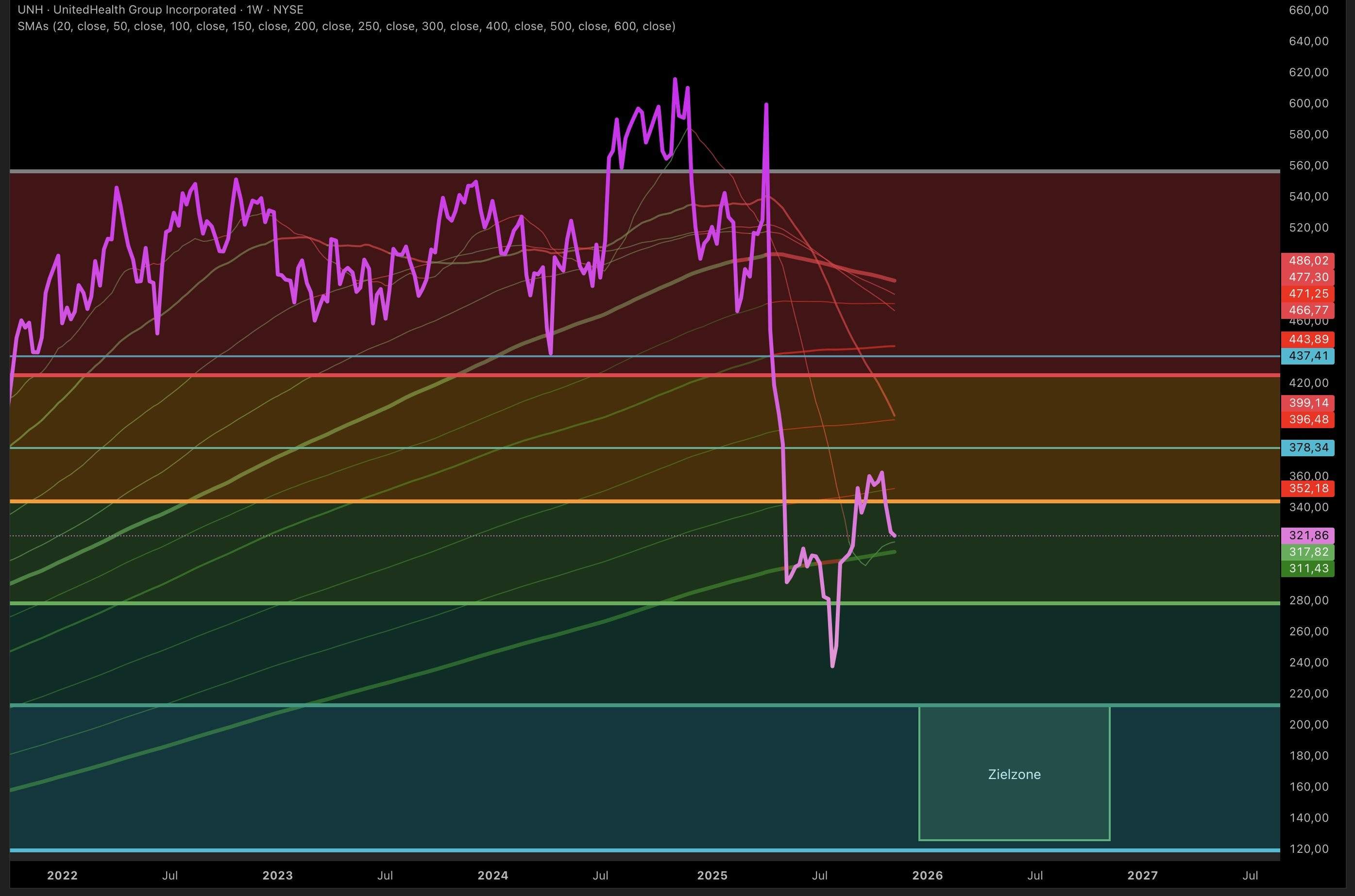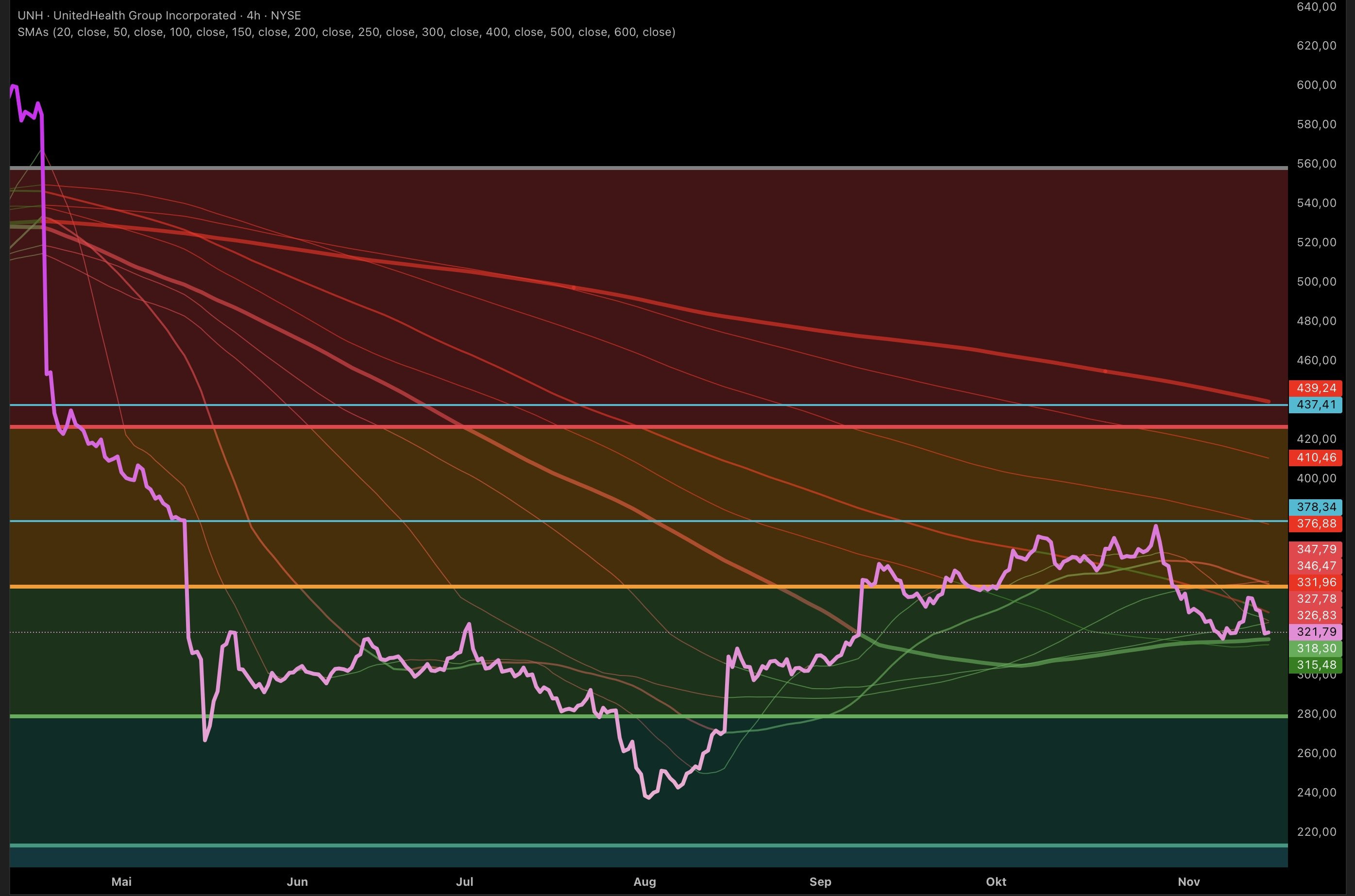 Ein kurzes Update zu UNH. An der grundsätzlichen Einschätzung hat sich auch bis heute nichts geändert. Im Tageschart wurden alle Durchschnitte SMA 50-600 (Bild 1) bis auf den 50 Tagesdurchschnitt nach unten durchkreuzt. Der bereits im August unterschritten 786er Fibonacci bei rund 280 Dollar muss halten oder der Weg ist frei für einen Kursverlust bis um die 200 Dollar, wo die nächste starke Unterstützung wartet.