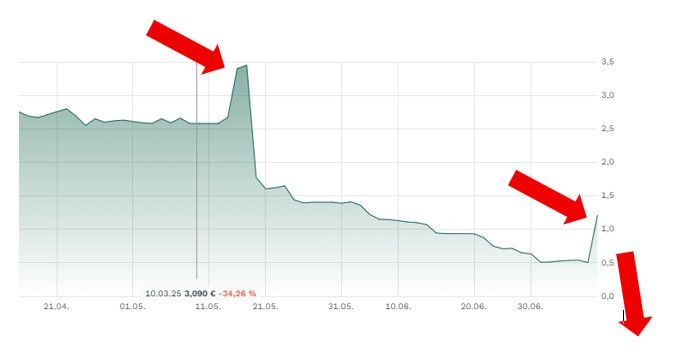 Der Wert ist damals kurzzeitig auf 2,30€ gefallen, die eigentlich letzte Möglichkeit für den EXIT. Dass dann ein paar Zocker eine Erholung ermöglicht haben, wäre dann aber wirklich die allerletzte Chance für einen Ausstieg gewesen.