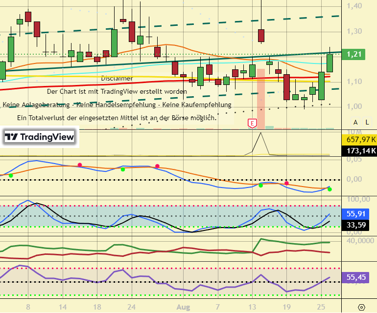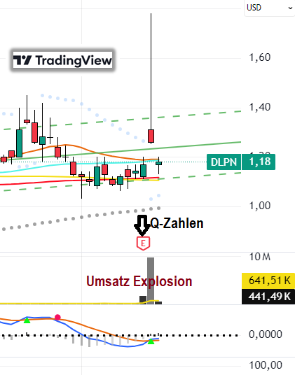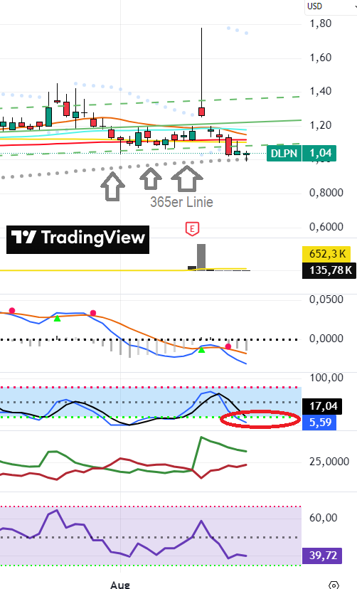 Der MACD (Moving Average Convergence Divergence) für Dolphin Entertainment (DLPN) ist positiv, laut TipRanks. Der RSI (Relative Strength Index) ist neutral, und der STOCH (Stochastic Oscillator) ist ebenfalls positiv. Am letzten Handelstag, Freitag, dem 15. August, fiel der Aktienkurs um -6,35% von 1,26 $ auf 1,18 $. Das Handelsvolumen sank ebenfalls am letzten Tag, was als positives Zeichen gewertet wird, da das Volumen dem Aktienkurs folgen sollte, so StockInvest.us.