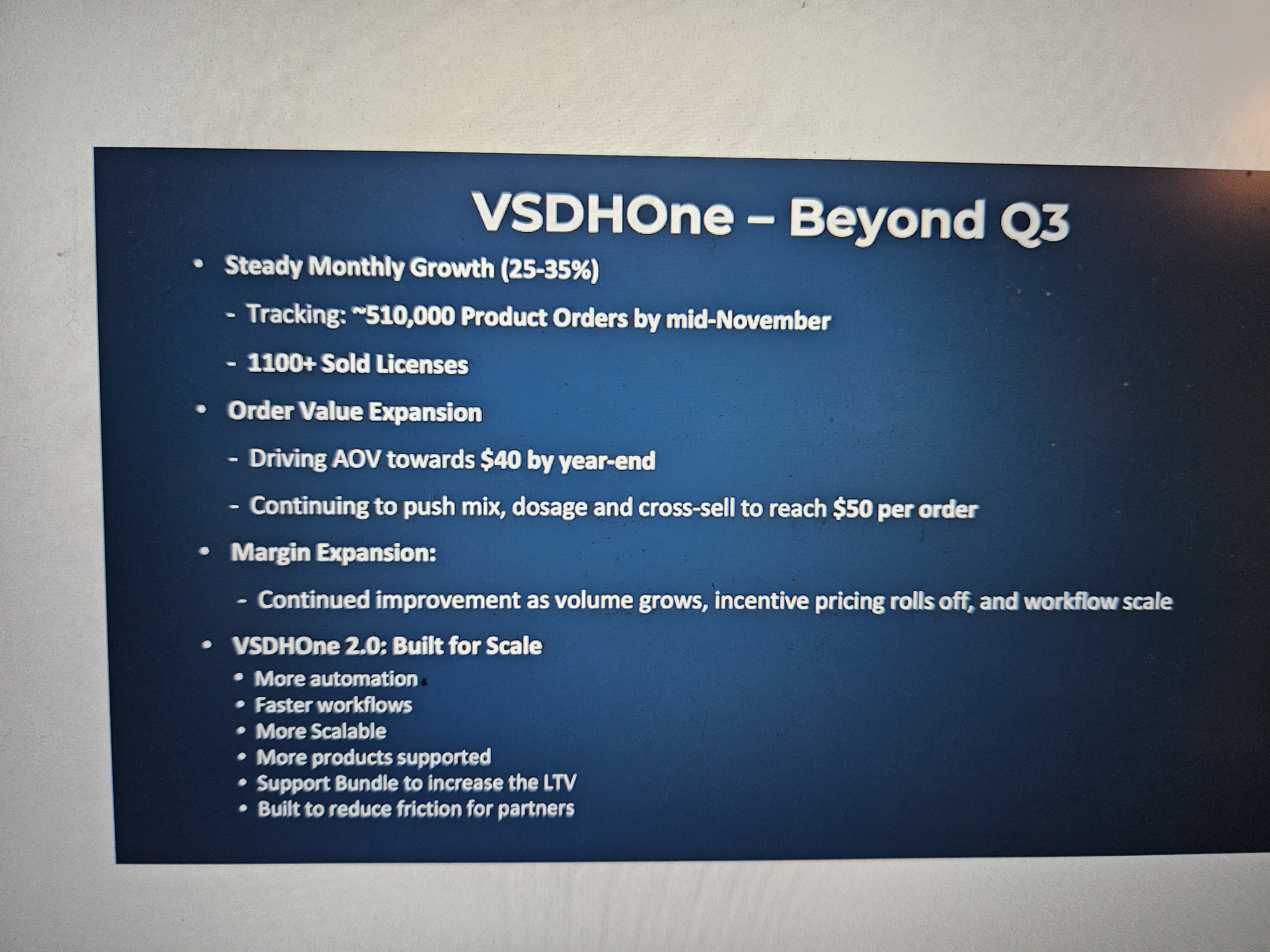 Im Call kam auch die Frage wie die 510T Bestellungen zu deuten sind. Es wurde gesagt dass dies YTD ist. Also zu den bestehenden 295T Bestellungen in Q3 sind in gut 5 Wochen des Q4 'nur’ 215T hinzugekommen. Damit würde die Bestellungen im Vergleich zum September mehr oder weniger stagnieren. Hinzu kommt dass der Order Value eher bei 20$ gelegen haben könnte anstatt bei 40$. Also ganz unverständlich finde ich die Kursreaktion daher nicht. Bisher hat man die Ziele eher übererfüllt und jetzt läuft man ihnen abrupt hinterher. Ich war davon auch überrascht und möchte jetzt auch erstmal sehen ob die Prognosen zum Order Value und Anzahl tatsächlich erfüllt werden können.