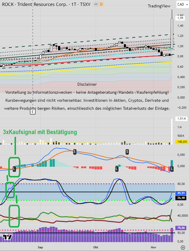 Dreifach Kaufsignal bei den Indikatoren. Das Muster bis zum Ausbruch gestern passte.
