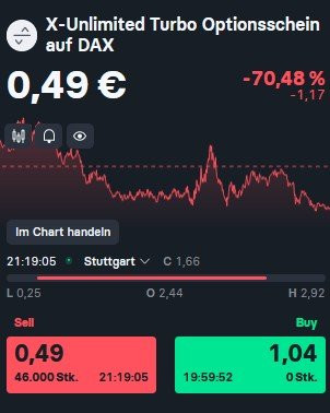 Zitat von cashburner99: Nicht nur bei BNP, ist ganz allgemein üblich, das die "knappen" Scheine im Abendhandel erst einen extrem hohen Spread bekommen und wenn's noch näher in Richtung KO läuft, nicht mehr verkauft werden.