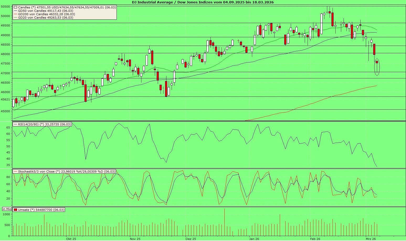 Zitat von Yankie:Zitat von wiesger: Der Dow Jones Kasse daily hat am Freitag einen lupenreinen Hammer ausgebildet (siehe Ellipse). Das könnte vorerst das Ende der Abwärtsbewegung sein. Eine Erholung bis 48.041 und mehr ist nicht unwahrscheinlich. Die Kerze wird negiert, wenn der Kurs auf Tagesbasis (Schlusskurs) unter 47.322 fällt. Mal schaun.