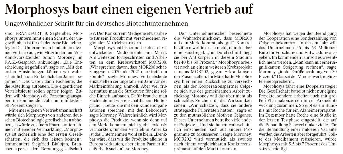 Roche entwickelt mit ACE910 einen ähnlichen Antikörper, dessen Marktpotential z.B. von der UBS mit 10 Mrd. USD beziffert wird. ACE910 dürfte Bayer dazu motiviert haben, das eigene Entwicklungsprojekt nunmehr etwas nachdrücklicher zu verfolgen. Insgesamt für Morphosys eine erfreuliche Nachricht.
