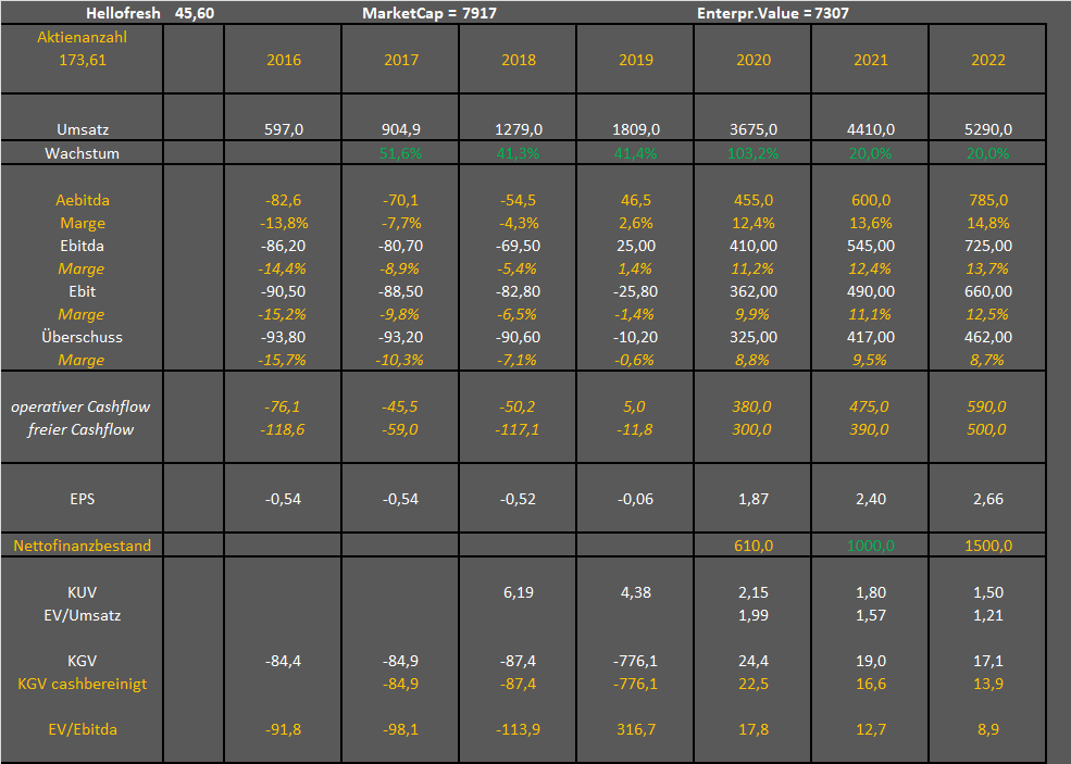 Aber wie gesagt, wenn es nur um Neukunden im bisherigen Geschäft ginge, könnte ich eine gewisse Skepsis ja sogar verstehen, zumindest was 2021 die Frage betrifft, ob Neukunden mögliche wieder abspringende Kunden mehr als ausgleichen (die Fluktuation ist bei HF ja schon etwas höher). Aber das ist halt nur ein kleiner Teil der Story. Zumal Diebel ja überhaupt nicht darauf eingeht, dass HF bei 35-37 € auch ohne Wachstum alles andere als hoch bewertet wäre. Ich frag mich was er da für Kennzahlen anlegt oder ob er überhaupt rechnen kann. Für ein Kursziel von 35 € müsste man eigentlich Umsatzrückgang unterstellen oder zumindest jahrelange Stagnation. Ist das realistisch, wenn man bedenkt, dass man auf der Plattform von HF diverse neue Produkte anbieten könnte, beispielsweise das Fertigessen von Factor75 auf alle Kunden weltweit ausweiten. Oder man geht wie angekündigt in neue europäische und asiatische Länder. Das sind ja faktisch auch Neukunden, wo man nicht Bestandskunden ausgleichen muss, die wieder abspringen.