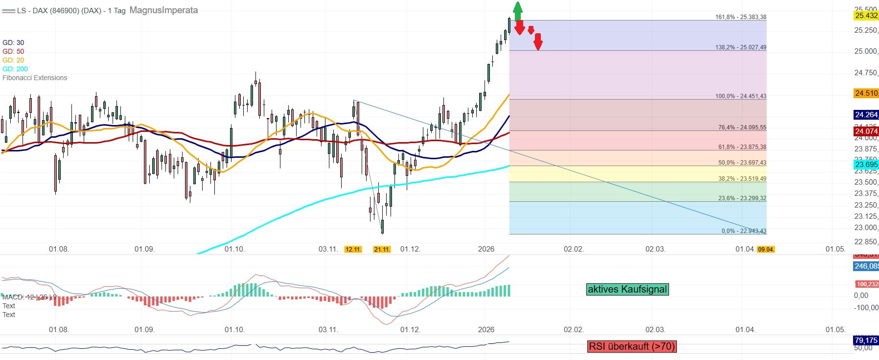 Da wir seit Donnerstag starke Rücksetzer von den neuen Hochs gesehen hatten, sollten insbesondere bei 25330 / 25350 wohl besser auch nochmal welche mit eingeplant werden. Von 25330 / 25350 sollten dabei durchaus nochmal 25200 / 25170 oder sogar auch 25100 und 25000 / 24970 angesteuert werden. Die drei Stationen sollten ganztägig Supportzonen bleiben um sich erneut nach oben zu probieren. Die weiteren Ziele oben wie 25420, 25469 oder 25530 sollte unser Dax aktiviert bekommen, indem er sich über 25330/ 25350 etabliert bekommt. So die Zusammenfassung von gestern.
