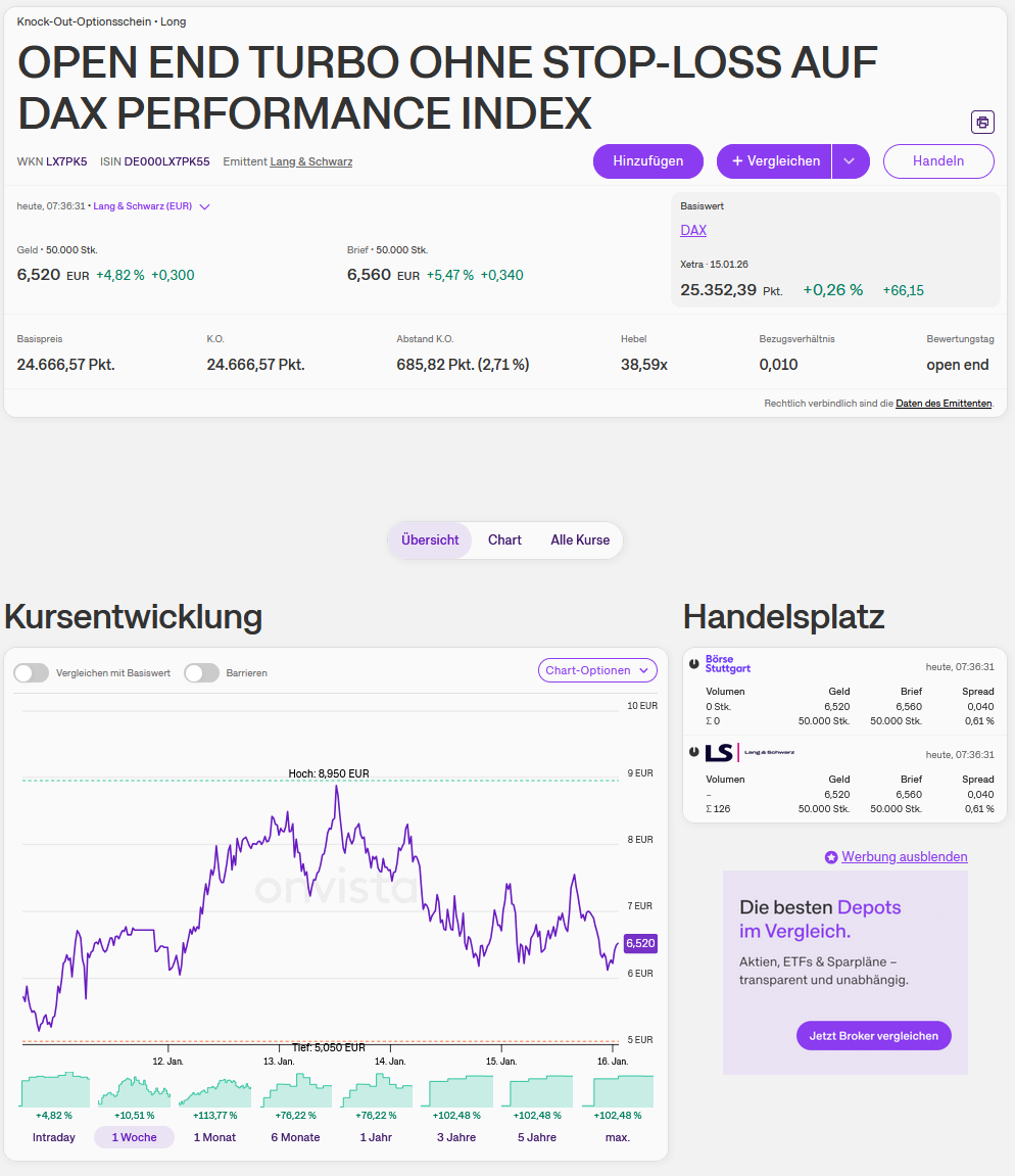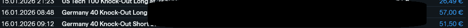 Trump und seine Zölle...wegen Grönland, ganz schnell: ab 1. Februar. Das haut den DAX außerbörslich ganz schön runter (im Moment ca. 25120) und wird am Montag auch im echten Handel so sein. Was bin ich froh, gestern alle Calls auf den DAX verkauft zu haben, ich habe nur noch Puts auf den DAX. Calls verkauft, denn nach dem Optionsscheinverfall und ohne Handel in den USA am Montag sollte es eher abwärts gehen. Zumal: Mit einer Eskalation habe ich in der nächsten Woche gerechnet, und dass das auf die Stimmung drückt, aber nicht, dass Trump schon so schnell die Zollkarte spielt. Mittelfristig kann (muss nicht) das erheblichen Einfluss auf die verschiedenen Börsen haben, es wird sehr spannend.