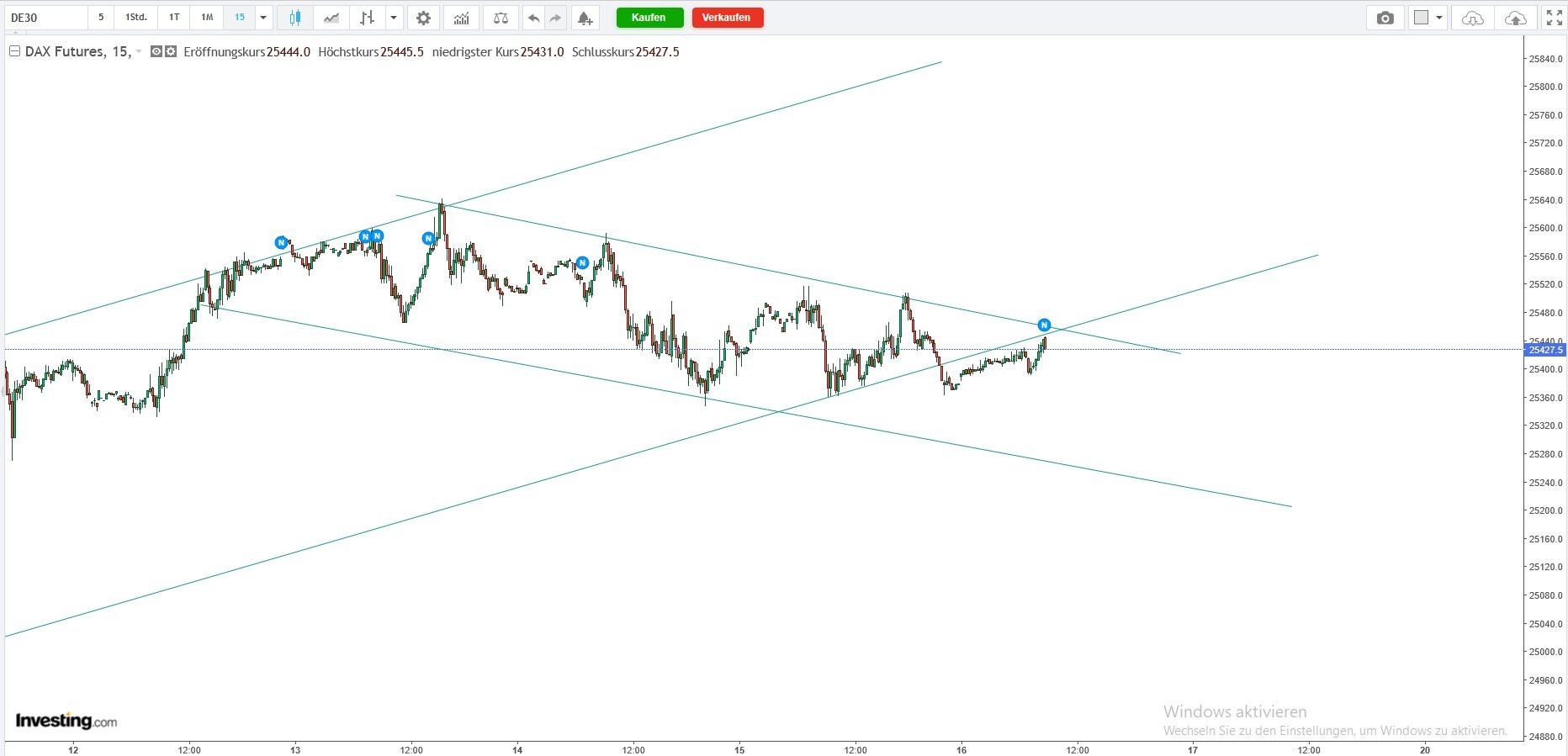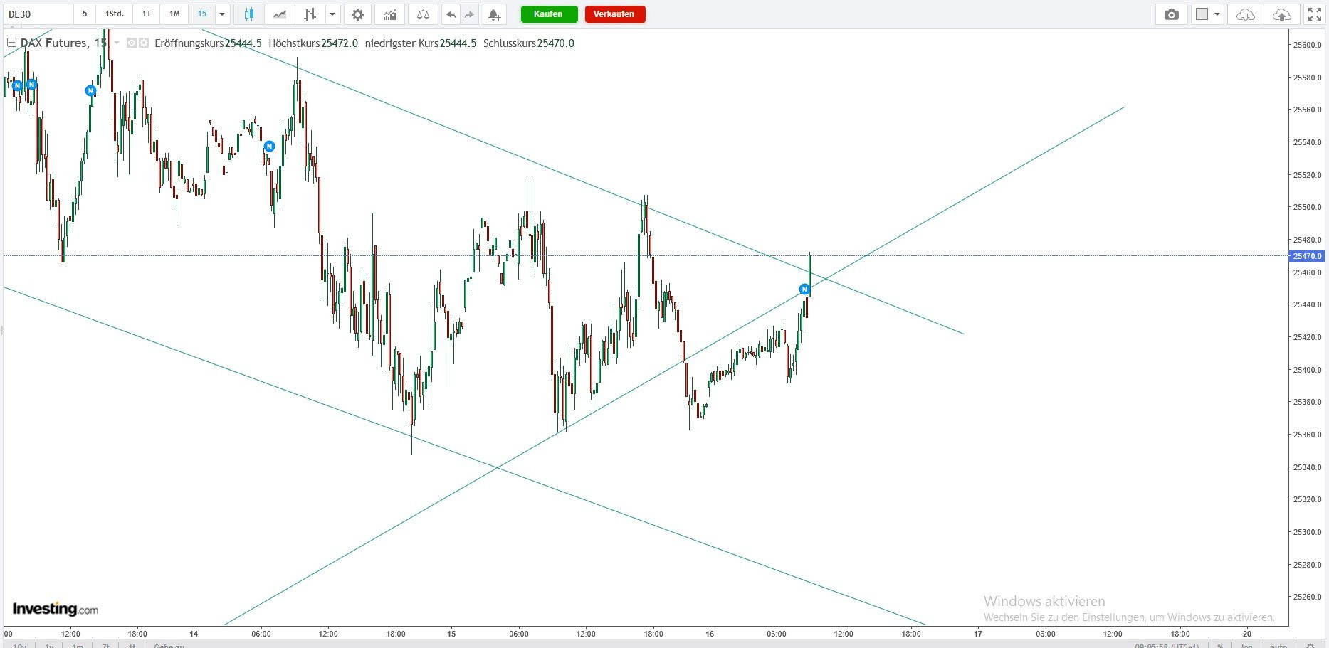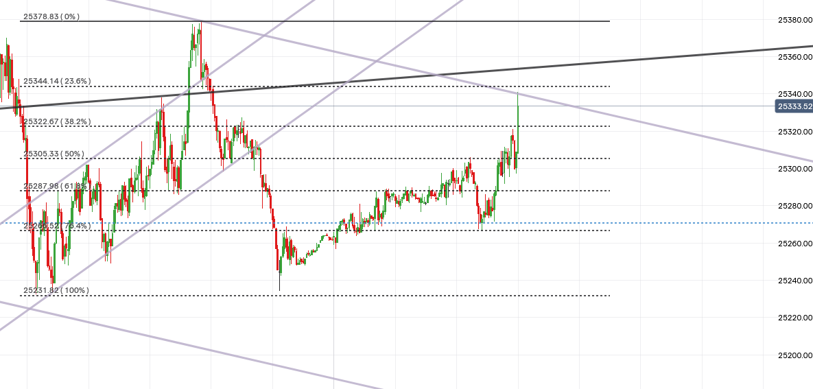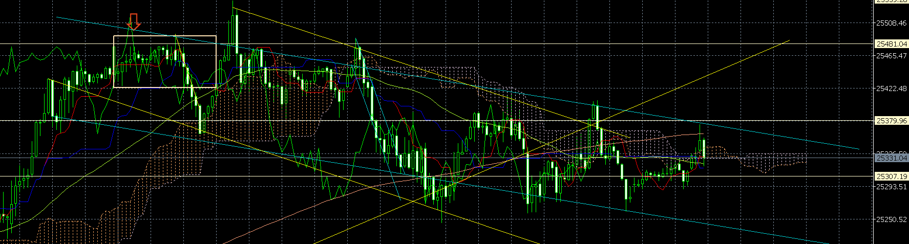 Tendenz: abwärts unterhalb von 25330 / 25360, darüber aufwärts