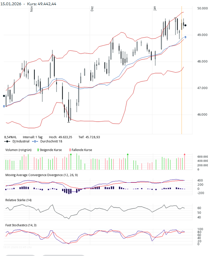 Dienstag gab es neuen Abgabedruck, der sich am Mittwoch bis 48.852 ausweitete. Dann gab es wieder Kaufinteresse und der Dow schloss am Freitag bei 49.359 Punkten.