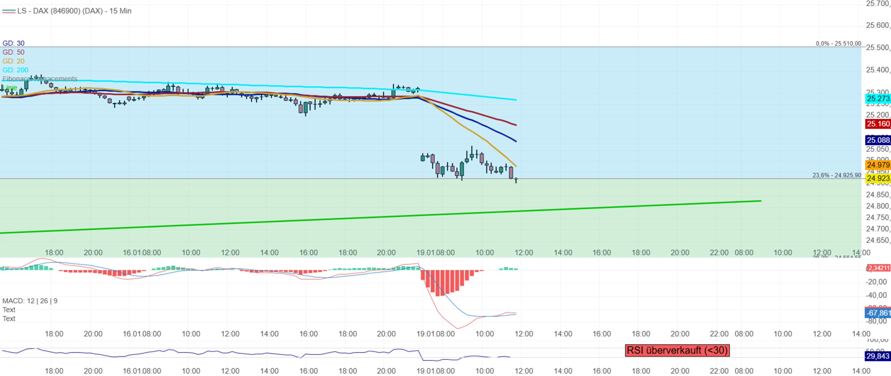 Und zu einem anderen Post von dir: Ja, an Tagen wie heute sind diverse Marken und Charts Makulatur. Damit muss man als Trader leben. Was man aber sieht, sind alte Unterstützungen, an denen man sehen kann, wie der Index dort bisher reagiert hat. Das kann man als Wert zum Wiedereinstieg nehmen oder auch zum Ausstieg. Deshalb, auch an Tagen wie heute kann man mit Charttechnik Geld verdienen.