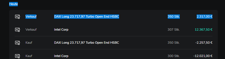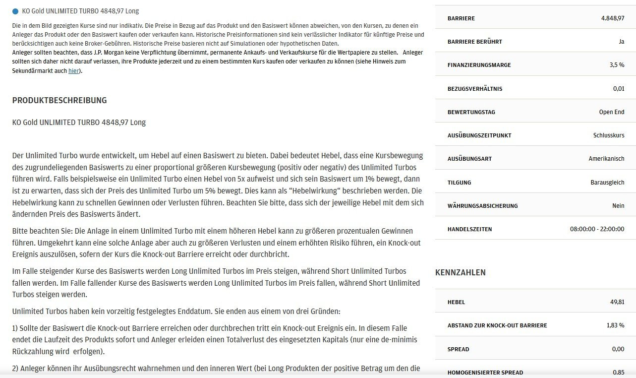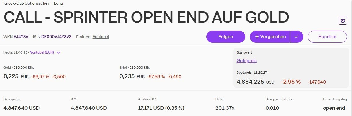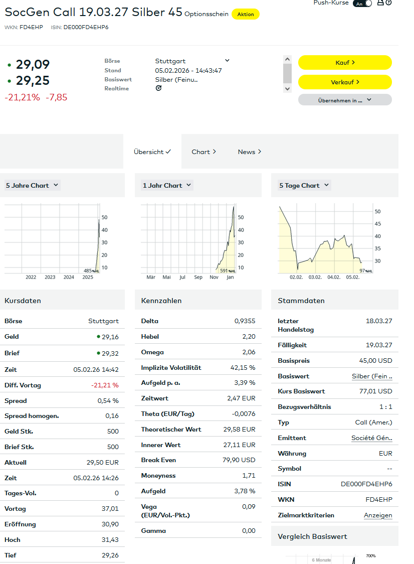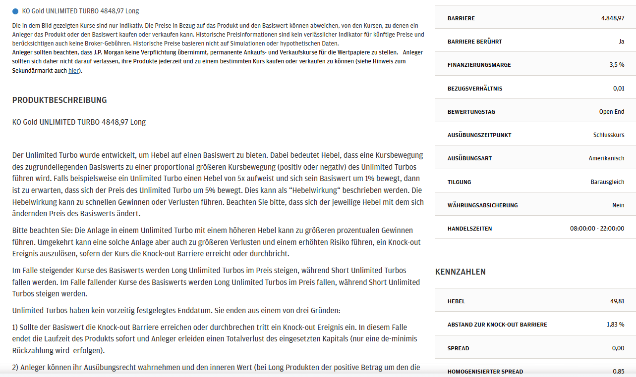 Heute ist nicht mein Tag, an keiner Börse (Vontobel direkt, Stuttgart Limit) bekomme ich einen trade hin. Es kommt die Meldung "Das Wertpapier befindet sich nicht im Produktangebot". Nach Recherche kommt raus, das Consors solche Derivate nicht zulässt. Also müsste ich sie über etoro oder so ordern. Wieder etwas gelernt.