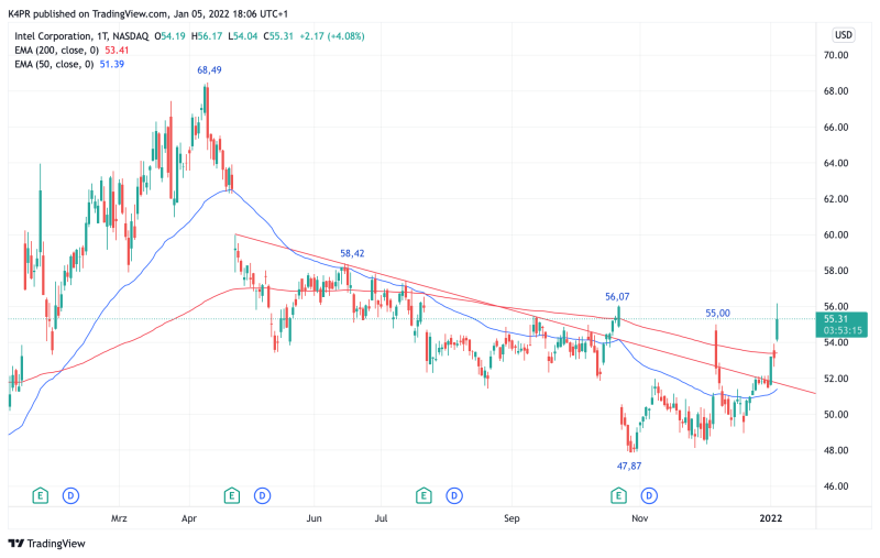 Der heutige Kurssprung über die Vorgängerhochs um 55,00 US-Dollar macht die Intel-Aktie sehr interessant, weitere Zugewinne in den Bereich von 57,45 und an den Horizontalwiderstand bei grob 58,47 US-Dollar wären auf Sicht der nächsten Wochen bei der aktuellen Aufwärtsdynamik denkbar und würden sich für ein kurzfristiges Long-Investment anbieten. Sollte die Intel-Aktie dagegen unter ein Niveau von mindestens 52,00 US-Dollar wieder zusammenbrechen, müssten Abschläge auf 50,00 und darunter sogar 47,87 US-Dollar zwingend einkalkuliert werden. Aktuell sieht es jedoch nach einer mittelfristigen Trendwendechance aus.