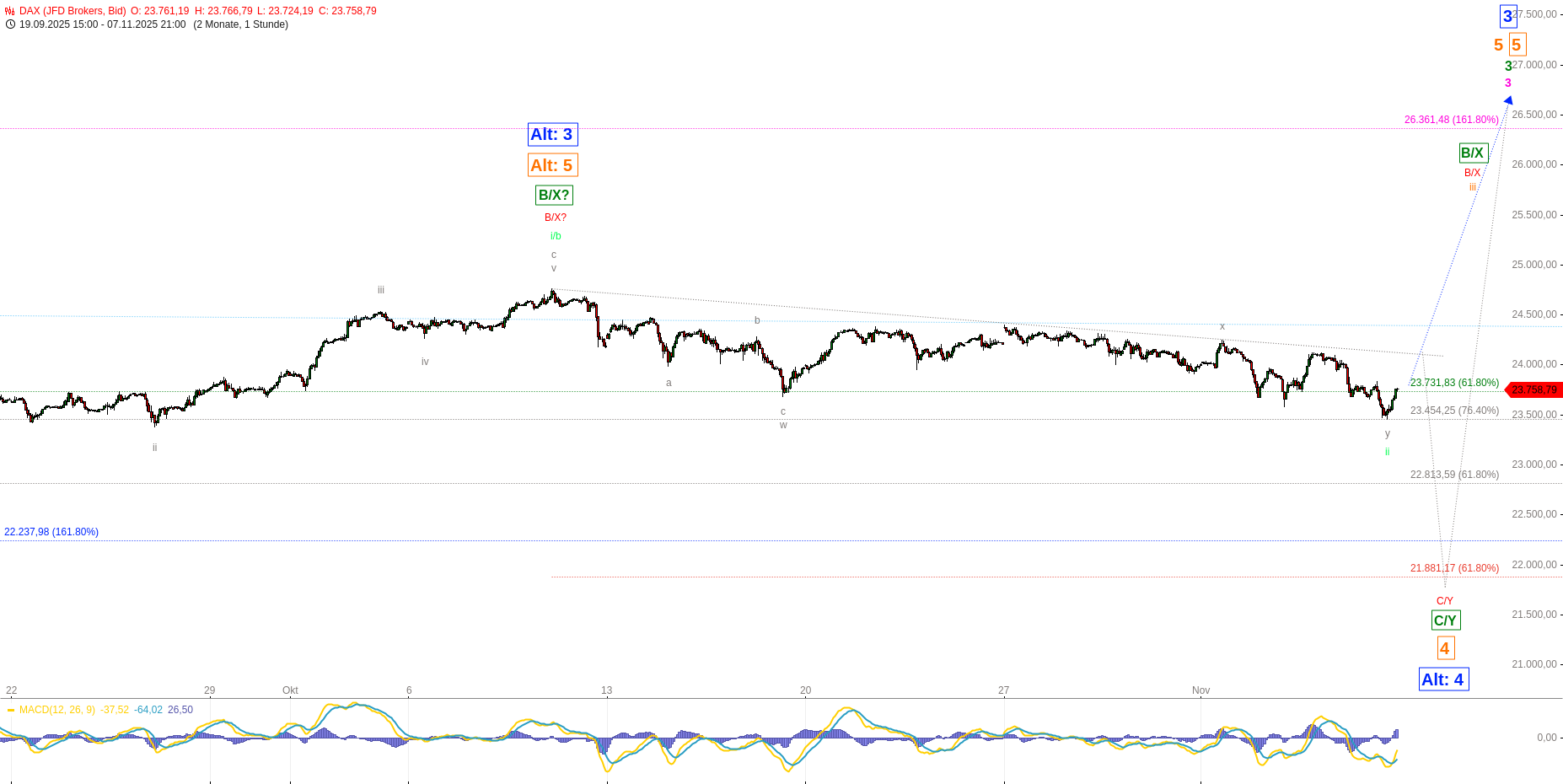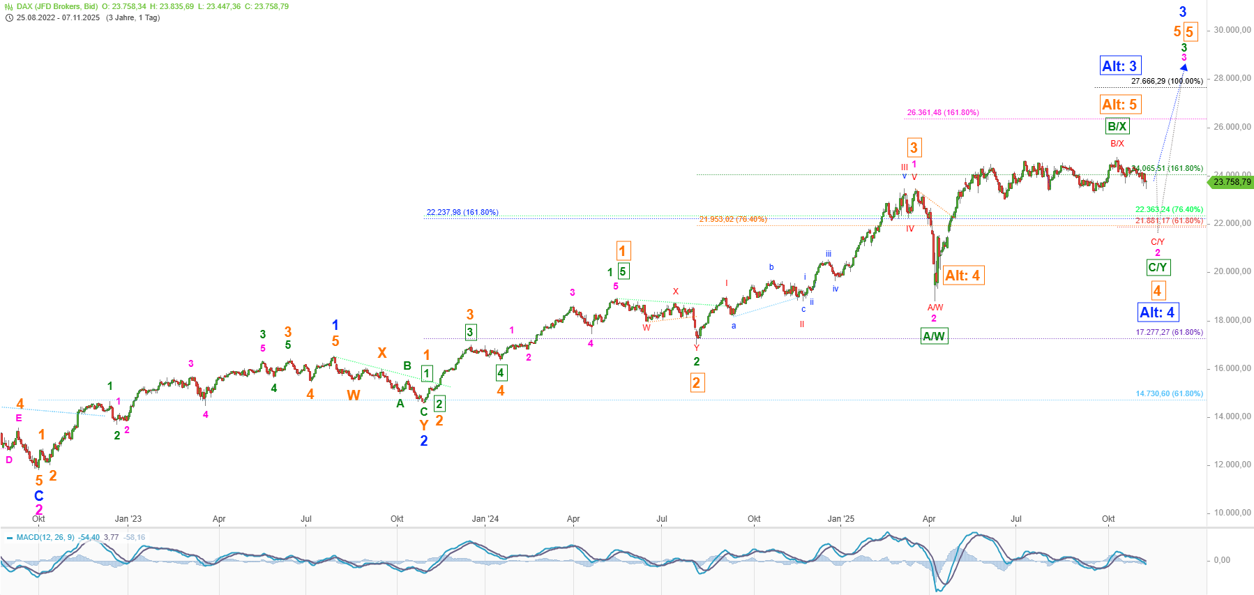In dieser Zählweise fehlt in der lila 3 noch ein signifikantes Hoch (blaue 5) und ein deutlicher Abschlussvorbote (blaue 4 derzeit mit 23er Mindestziel 22363 – hellgrüne Fibos).