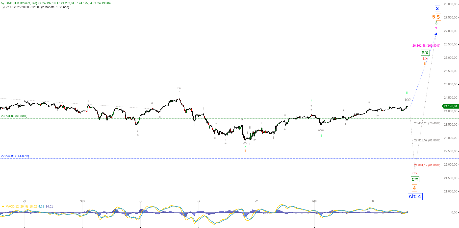 Das Mindestziel einer laufenden lila 3 (bisher 24765) liegt bei 24918. Die lila 3 hat vermutlich die orangene i=24489 und kurze orangene ii=22979 (hellgrüne a=23022, hellgrüne b=24765, hellgrüne c=22893) beendet. Der Zielbereich der laufenden orangenen iii (bisher 24186; hellgrüne i=23885, hellgrüne ii=23427, hellgrüne iii bisher 24225) liegt derzeit zwischen 24982 und 27281 (blauer Pfad).