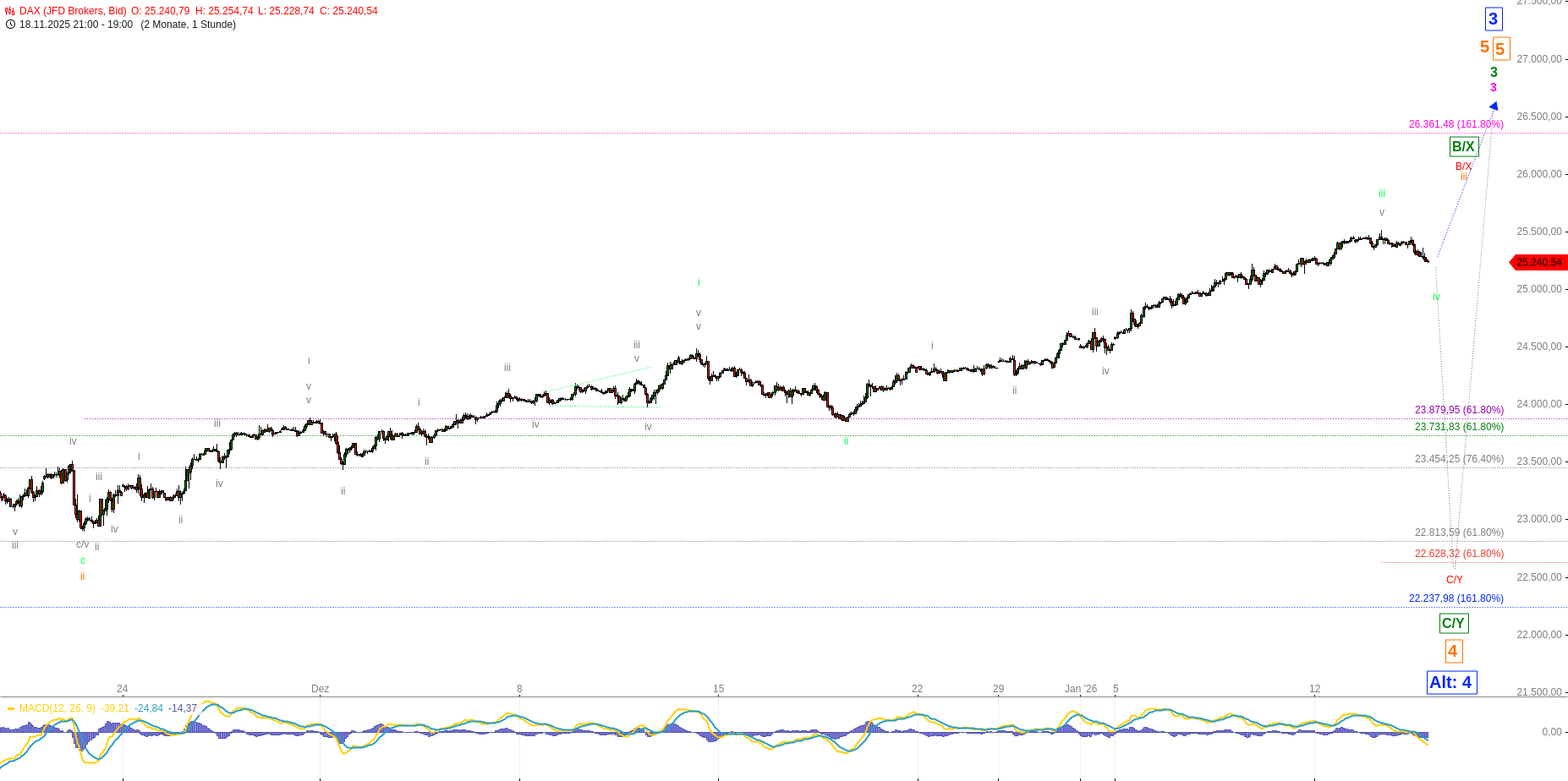 Die grüne A/W=18809 hat die MOB 18940 der orangenen 4 gerissen. Die grüne Alt: B/X (bisher 25512) hat ihr Idealziel deutlich hinter sich gelassen und hat auf der Oberseite Platz bis 26361 (lila Fibos).