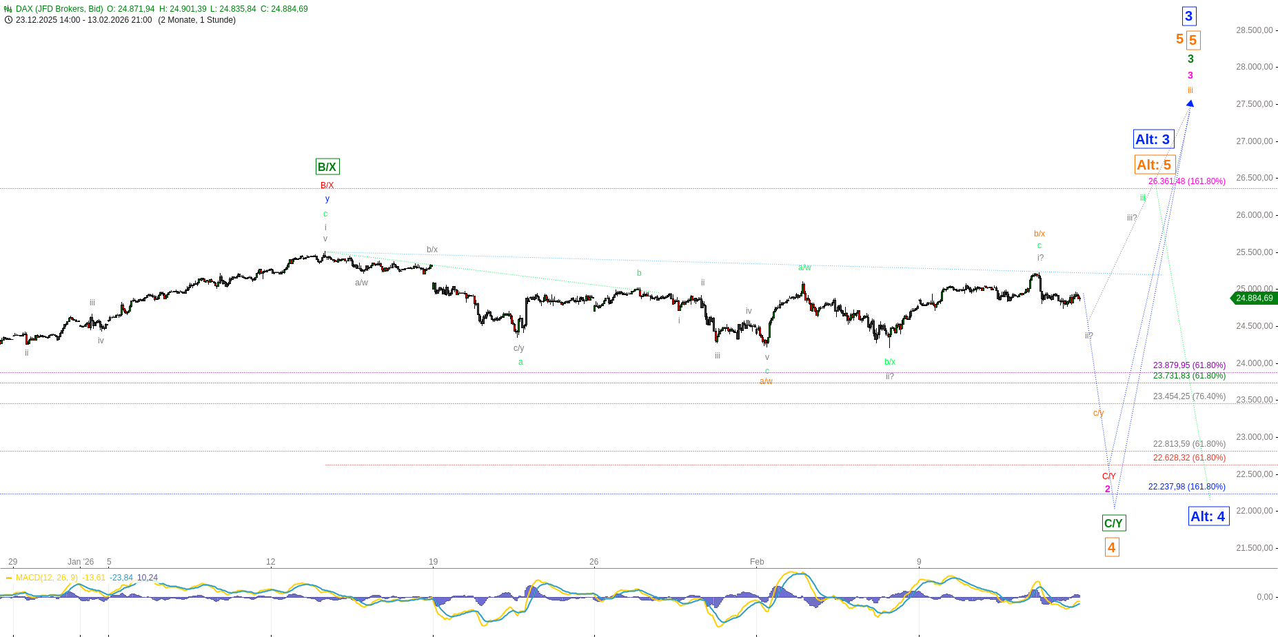 Der Tageschart zeigt den Verlauf des DAX in den letzten beiden Jahren. Dieser Verlauf zeigt nach dem Abschluss der lila 1=13827 und der überschiessenden lila 2=11807 die laufende lila 3 (bisher 25512). Der Zielbereich einer kurzen impulsiven lila 3 zwischen 16297 und 25634 wurde bereits erreicht und mit dem Anstieg oberhalb 16297 bestätigt. Eine gedehnte lila 3 kann jedoch nicht ausgeschlossen werden.